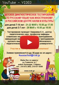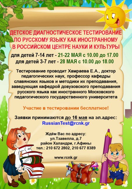 Детское тестирование по русскому языку для детей 3 - 14 лет в Российском Центре Науки и Культуры (РЦНК) г. Афины