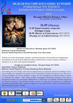 C 20 по 28 мая 2016 года в рамках перекрестного года России и Греции при поддержке Министерства культуры России, Министерства иностранных дел Греции, Министерства культуры Греции, Посольства России в Греции, Генерального консульства России в Салониках, Муниципалитетов г. Афины и г. Салоники пройдет "Неделя российского кино в Греции".